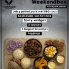 Wat zit er allemaal in de box?Juicy pulled pork met BBQ saus, frisse koolsalade (coleslaw), spicy wedges, 2 sausjes, broodjes.